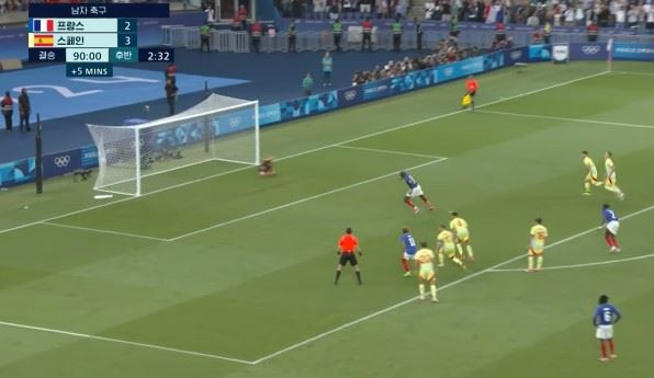 프랑스의 장-필리페 마테타가 9일(현지 시각) 프랑스 파리의 파르크 데 프랭스에서 열린 스페인과의 '2024 파리올림픽' 남자 축구 결승전 후반 인저리 타임에서 극적인 페널티킥을 성공시키고 있다. SBS 중계