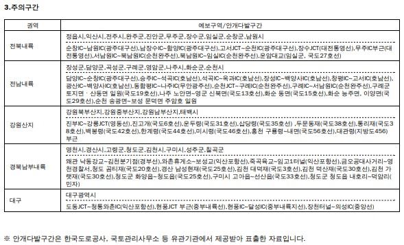 - 특히, 강이나 호수, 골짜기에 인접한 도로에서는 주변보다 안개가 더욱 짙게 끼는 곳이 있겠으니, 차량 운행 시 감속 운행하여 추돌사고 등의 피해가 발생하지 않도록 교통안전에 각별히 유의하기 바랍니다.