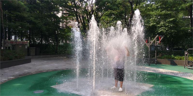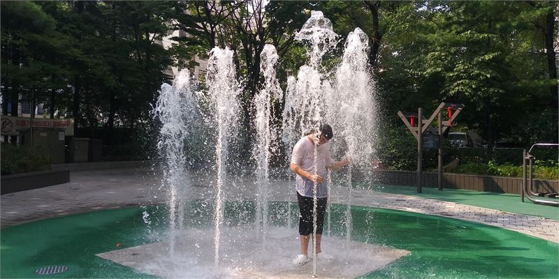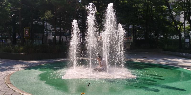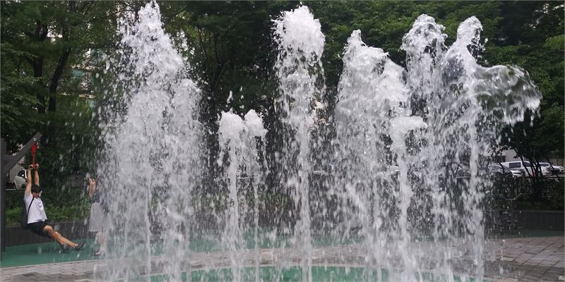 주위의 눈치를 보던 학생이 체면을 내려놓고 드디어 분수의 유혹에 넘어가 시원한 물줄기와 한몸이 됐네요. 폭염 속에 놀이터에서 놀다가 흘러내리는 땀을 주체하지 못했나 봅니다.