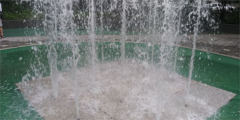 뙤약볕 폭염 속에서 분수들이 보기만 해도 시원해지는 물줄기를 뿜어 올리고 있습니다. 한 학생이 놀이기구에서 놀면서 더워지자 분수 물줄기를 탐하고 있는 모습입니다.