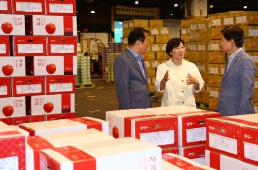 송미령 농식품부 장관은 이날 가락시장 현장 점검에서 “올해 사과, 배 등 과일은 작황이 좋아 생산량도 늘고 추석 기간중 출하량도 늘어날 것으로 전망된다”며 “산지에서 우리 농업인들이 품질 좋고 맛있는 과일이 많이 생산될 수 있도록 노력해 주신만큼, 도매시장에서는 신속하게 소비지에 전달될 수 있도록 공급에 최선을 다해달라”고 요청했다.