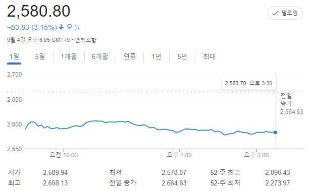 개장 지수는 전장 대비 74.69포인트(2.80%) 내린 2589.94로 출발했고 장중 2%대를 이어갔다. 장중 한때 2578.07로 2580선을 내주기도 했다.