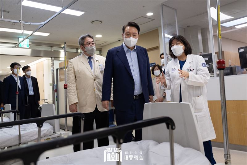 윤 대통령은 방문 현장에서 응급실 의료진의 업무 강도가 타 분야보다 매우 높은 데도 기존 정부의 수가(의료행위 금전적 대가) 정책 등 의료 제도가 현장의 어려움을 제대로 반영하지 못했다는 점을 지적했다.