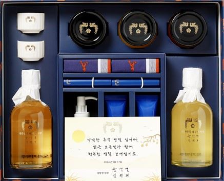 윤석열 대통령의 올 추석 선물 세트. 전통주와 화장품 세트로 구성됐다. 대통령실