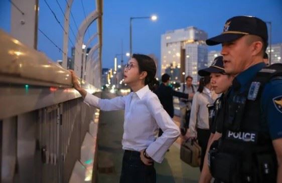 김건희 여사가 세계 자살 예방의 날인 지난 10일 자살 예방 및 구조 관계자를 격려하기 위해 서울 마포경찰서 용강지구대 근무자들과 마포대교 도보 순찰에 동행하며 철망을 쳐다보고 있다. 대통령실