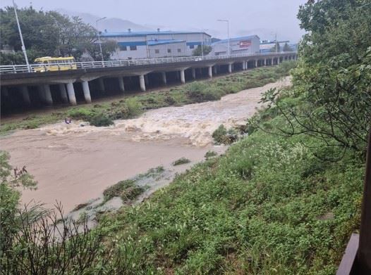남부 지방에서 가장 비가 많이 내린 경남 창원시 남천에 21일 오전 폭우로 빗물이 막 쏟아져 들어오고 있다. 남천은 창원국가공단 인근을 지난다. 창원에는 추분 절기가 무색하게 이틀간 500mm가 넘는 폭우가 내려 곳곳에서 물난리를 겪었다. 독자 정재송 씨 제공