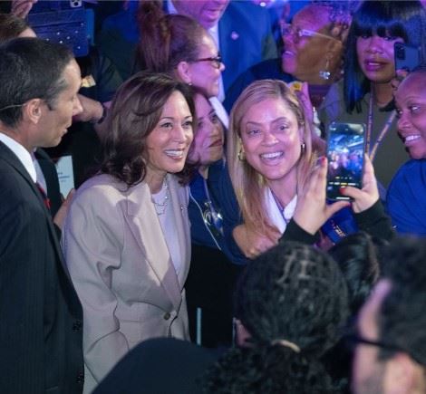 미 대선 민주당 후보인 해리스 부통령이 지지자들에게 둘러싸여 있다. 해리스 페이스북
