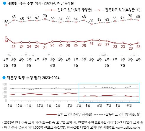 28일 한국갤럽에 따르면 9월 넷째주 조사 결과 윤석열 대통령의 직무수행 긍정 평가는 2주 전 역대 최저치(20%)보다 3%포인트 오른 23%로 나타났다.