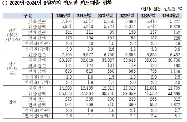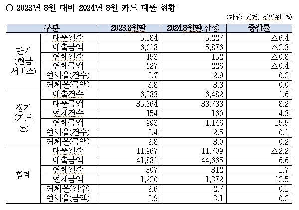 카드 대출 금액은 2023년 8월말 41조 8,810억원인데 반해 2023년 8월말에는 1조 3,720억원으로 6.6% 증가하였으며, 연체 금액은 2023년 8월말 1조 2,220억원이었으나 2024년 8월말에는 1조 3,720억원으로 12.5%나 증가하였다.