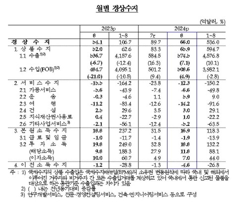 한국은행은 8일 발표한 '2024년 8월 국제수지'에서 8월 경상수지는 66억 달러(약 8조 8900억 원) 흑자로 넉 달 연속 흑자를 기록했다고 밝혔다.