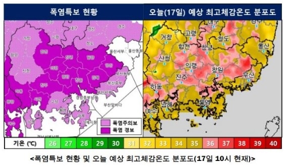 경남 진주의 낮 최고기온이 38도를 찍은 추석(9월 17일)의 부울경 폭염특보 현황. 부산기상청