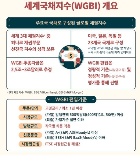 글로벌 지수 제공업체인 영국 파이낸셜타임스 스톡익스체인지(FTSE) 러셀은 8일(현지 시각) 채권 국가 분류 반기별 리뷰 결과에서 "한국을 2025년 11월부터 WGBI에 추가할 예정"이라고 밝혔다. WGBI는 26개국의 국채가 편입돼 있으며 블룸버그-버클레이즈 글로벌 종합지수, 제이피(JP)모건 신흥국 국채지수와 함께 세계 3대 채권지수로 꼽힌다.