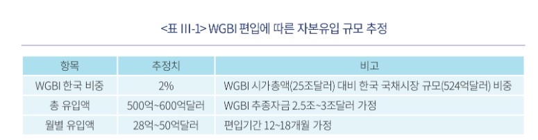 WGBI 추종자금은 2조~2조 5000억 달러로 추정되며 국내 총 유입액은 500억~600억 달러로 예상된다.