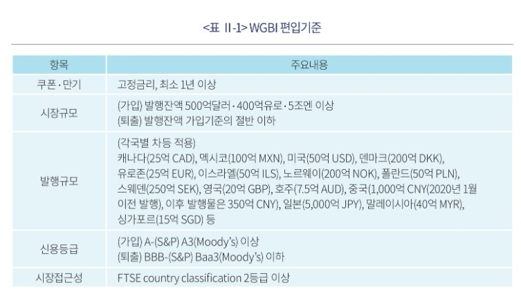 그동안 한국은 시장 접근성 수준이 기준에 미치지 못했다.한국이 WGBI에서 차지하는 비중은 2.0~2.5%로 평가된다.