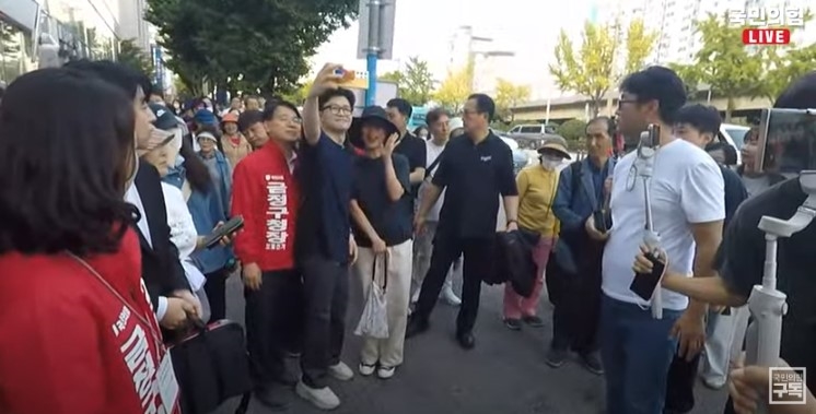 한동훈 국민의힘 대표가 12일 부산 금정구 거리유세에서 지나던 한 시민과 같이 휴대전화로 사진을 찍고 있다. 국민의힘TV