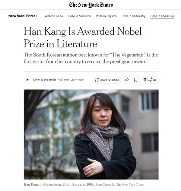 한강의 노벨문학상 수상을 보도한 뉴욕타임스. NYT