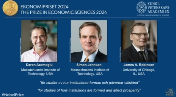 스웨덴 왕립과학원은 14일(현지 시각) "제도가 어떻게 형성되고 번영에 영향을 미치는지에 대한 연구 공로를 인정해 이들에게 노벨 경제상을 수여하기로 했다"고 밝혔다.