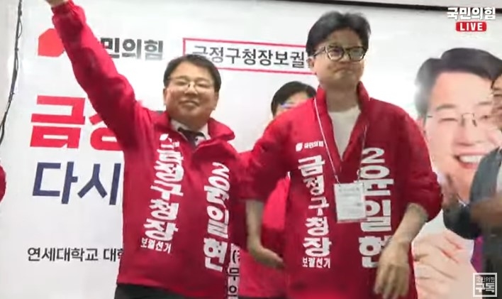 윤일현 부산 금정구청장 후보와 한동훈 국민의힘 대표가 부산에서 지지를 호소하고 있다. 국민의힘TV
