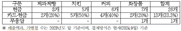 이들 프랜차이즈 가맹본부가 가맹사업자로부터 받는 대금결제 방식을 보면, 현금과 카드 모두 대금결제가 가능한 브랜드는 13개(33.3%)밖에 되지 않았다. 나머지 26개 브랜드는 현금으로만 납품대금(66.7%) 등을 결제하고 있었다.