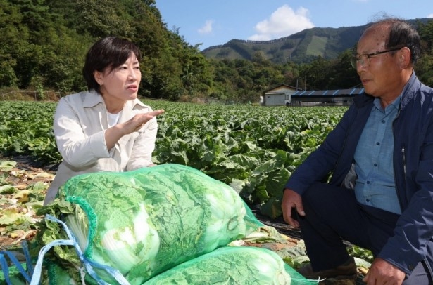 송미령 농림축산식품부 장관이 지난 10월 9일 충북 단양군 배추밭을 찾아 10월 중순과 하순에 출하될 배추 생육 상황과 출하 동향을 점검하고 있다. 농식품부