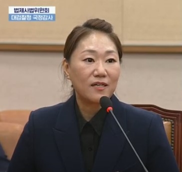 명태균 씨가 '실소유주'로 알려진 미래한국연구소 직원 강혜경 씨가 21일 국회 법사위 대검찰청 국정감사에 증인으로 출석해 의원들의 질의에 답변하고 있다. 국회방송