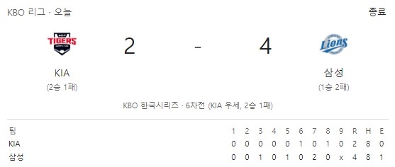 KIA 타이거즈와 삼성 라이온즈의 한국시리즈 3차전 경기 결과. 구글