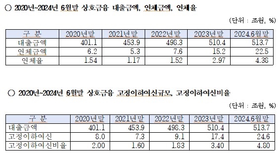강민국 의원이 금융위원회로부터 받은 '상호금융업권 대출 및 연체 규모'에 따르면 지난 6월 말 현재 상호금융의 대출금은 513조 7000억 원이며, 연체 금액은 22조 5000억원으로 연체율이 4.38%에 달했다.