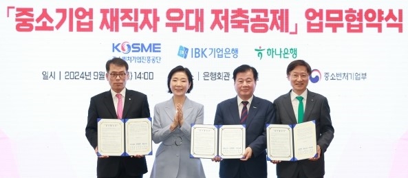 '중소기업 재직자 우대 저축공제 업무협약식'에서 참석자들이 기념촬영을 하고 있다. 왼쪽부터 김성태 기업은행장, 오영주 중소벤처기업부 장관, 강석진 중소벤처기업진흥공단 이사장, 이승열 하나은행장. 중기부