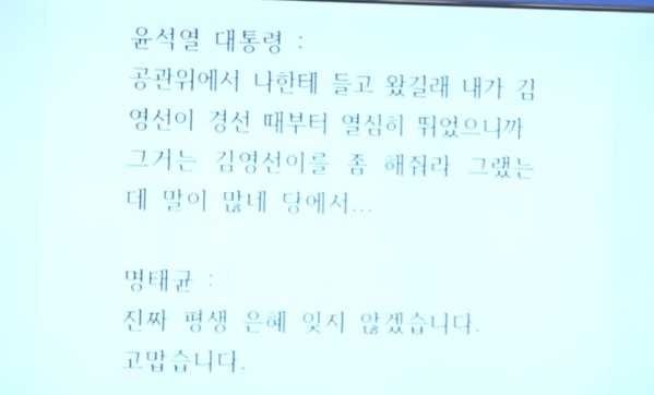 이 녹취록엔 윤 대통령이 명 씨에게 "공관위에서 나한테 들고 왔길래 내가 김영선이 경선 때부터 열심히 뛰었으니까 그것은 김영선이를 좀 해 줘라"는 음성이 담겼다.