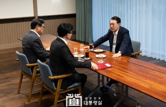 윤석열 대통령과 한동훈 국민의힘 대표가 지난 10월 21일 용산 대통령실 파인그라스에서 정치 현안을 논하고 있다. 한 대표 옆은 정진석 대통령 비서실장이 배석했다. 부하를 다루는 듯한 윤 대통령의 환담 자세를 두고 여론은 썩 좋지 않았다. 대통령실
