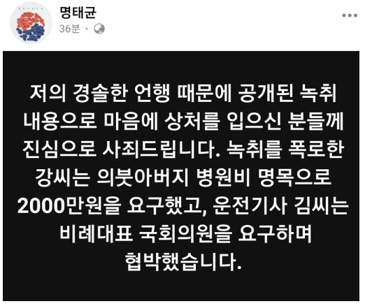 명 씨는 이 글을 통해 "(저의 통화) 녹취를 폭로한 강 씨(강혜경 미래한국연구소 직원)는 의붓아버지 병원비 명목으로 2000만 원을 요구했고, 운전기사 김 씨는 비례대표 국회의원을 요구하며 협박했다"고 주장했다.