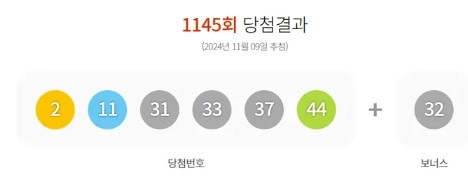 9일 추첨한 1145회 로또 1등 당첨 번호는 '2·11·31·33·37·44'다. 보너스 번호는 '32'다.