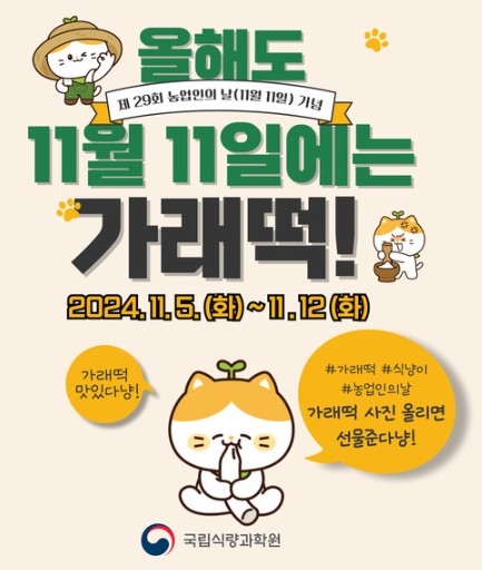 농림축산식품부는 지난 2006년 11월 11일을 '가래떡 데이'로도 정해 매년 홍보와 기념 행사를 하고 있습니다. '11월 11일'은 가래떡 4개가 세워져 있는 모습입니다. 그럴듯하게 잘 지정했다고 봅니다.