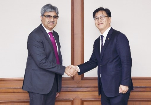 김범석(오른쪽) 기획재정부 1차관이 19일 서울 영등포구 한국수출입은행에서 라훌 아난드(Rahul Anand) 국제통화기금 한국미션단장과 악수를 하고 있다. 기재부