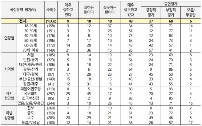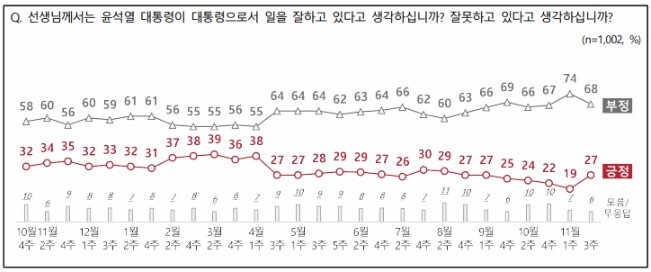 엠브레인퍼블릭, 케이스탯리서치, 코리아리서치, 한국리서치가 지난 18~20일 만 18세 이상 남녀 1002명을 대상으로 한 전국지표조사(NBS)에 따르면 윤 대통령이 국정운영을 잘한다고 한 응답자의 비율은 27%였다. 부정적 평가는 직전보다 6%p 떨어진 68%였다.