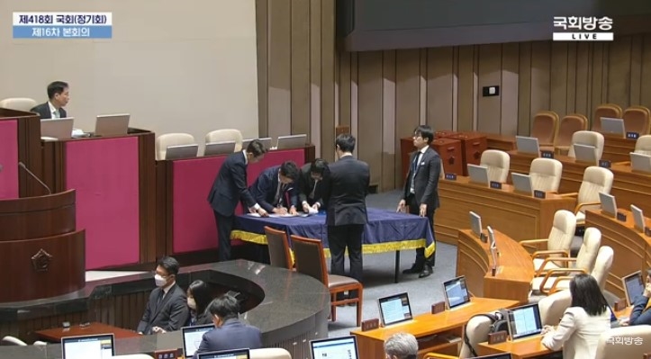 지난 4일 새벽에 열린 국회 비상계엄 해제 안 표결에서 국회 관계자들이 득표 수를 세고 있다. 국회방송
