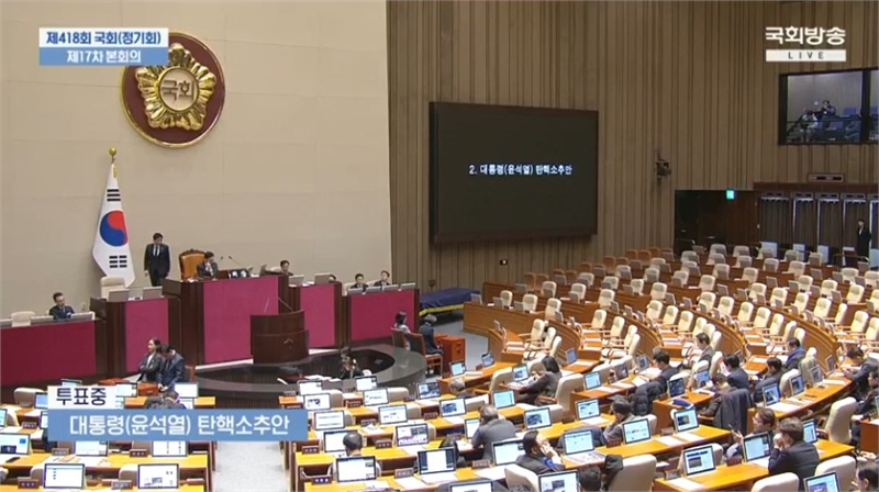 우 의장은 탄핵안 표결을 진행하던 중 “국민의힘 의원 여러분께 호소한다. 투표에 동참하라”고 요청했다.