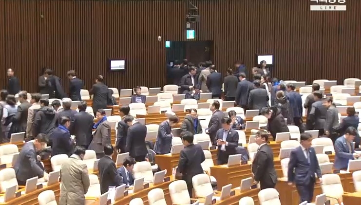 '윤석열 대통령 탄핵안' 표결 무산이 밤 늦게 결정되자 민주당 의원들이 국회 본회의장을 빠져나가고 있다. 국회방송