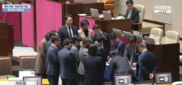 야당 의원들이 지난 4일 새벽 윤석열 대통령이 전날 밤 선포한 비상계엄 무효 투표 개표 상황을 지켜보고 있다. 국회방송