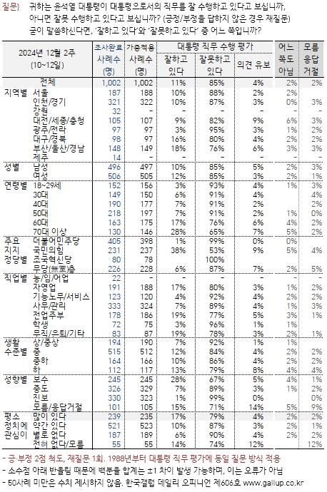 '12·3 비상계엄 사태' 후폭풍으로 윤석열 대통령의 국정 수행 지지율이 11%로 역대 최저치를 기록했다.