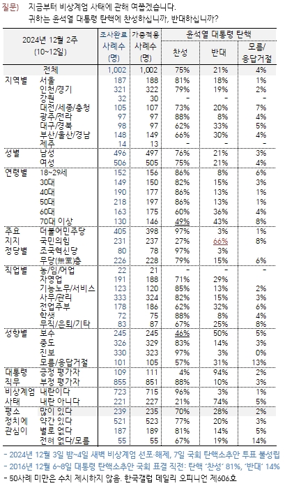 윤 대통령 탄핵 조사에선 국민의 75%가 찬성 의견을 냈다. 반대 의견은 21%, 4%는 의견을 유보했다.
