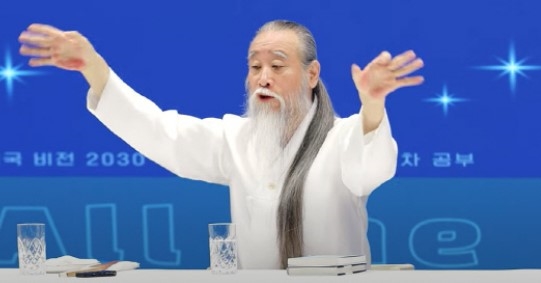역술인 천공이 18일 자신의 유튜브 채널에서 윤석열 대통령이 '탄핵의 강'을 건널 것이라고 주장하고 있다. 유튜브 캡처