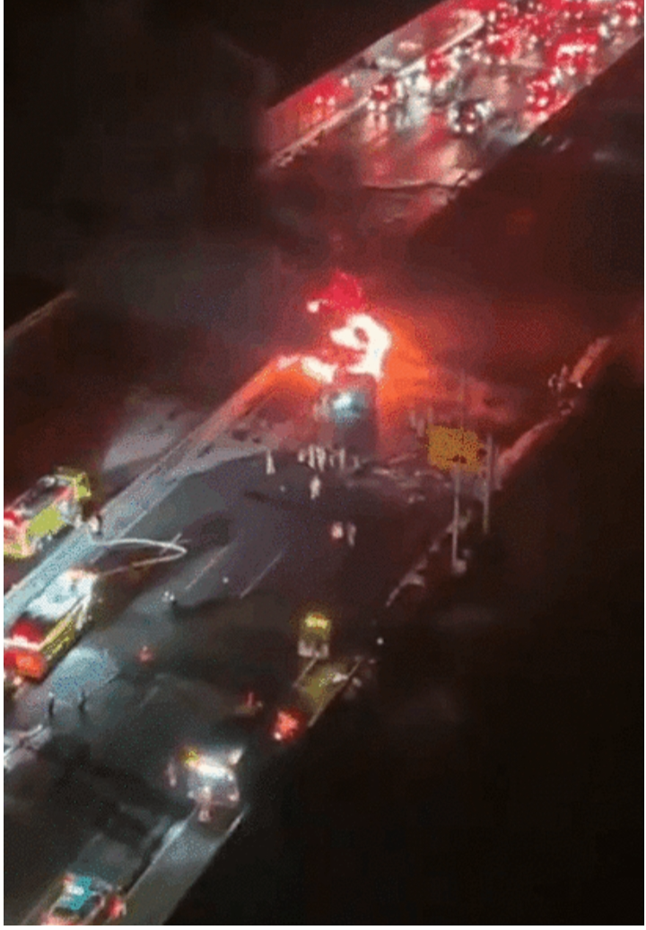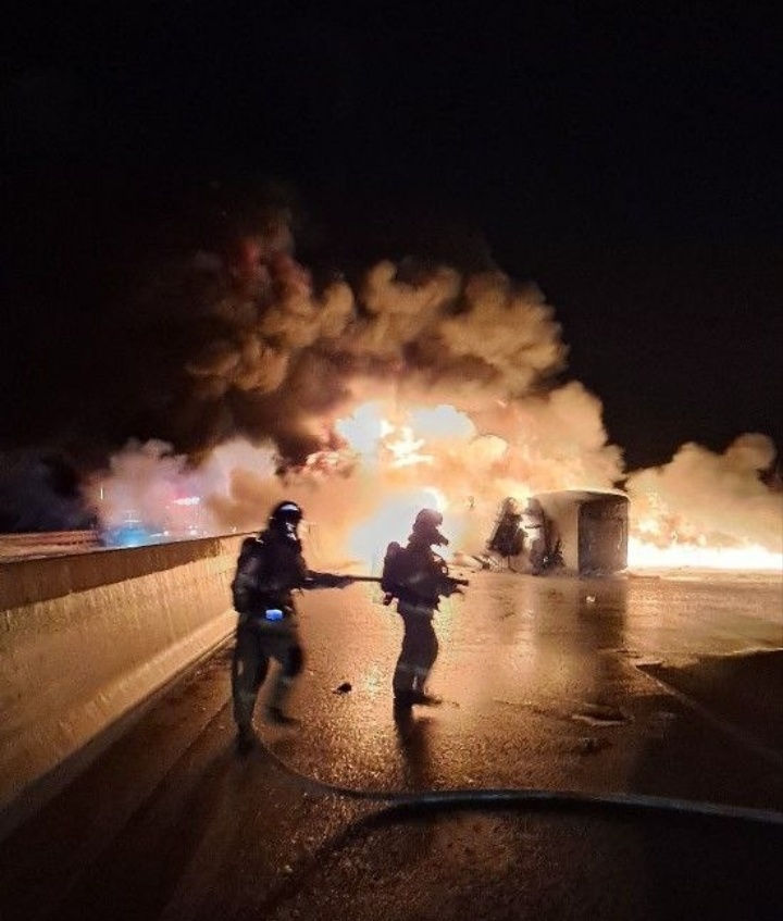 23일 밤 발생한 서해안고속도로 서평택IC 인근 유조차 화재 현장 모습. 양방향 도로가 통제되고 있다. 경기도소방재난본부