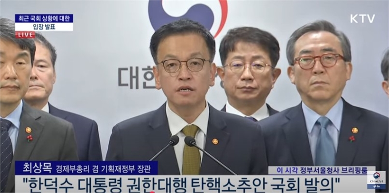 최 부총리는 “여야 정치권에 간곡히 호소한다. 한 권한대행의 탄핵소추를 재고해 달라”고 요청했다.