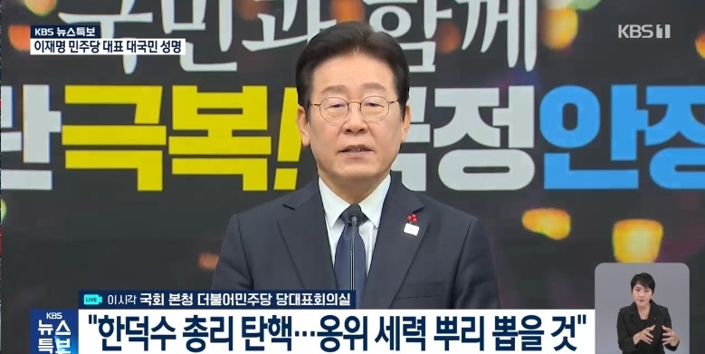 더불어민주당 이재명 대표가 27일 오전 서울 여의도 국회에서 한덕수 대통령 권한대행 국무총리 탄핵소추 등 정국 상황에 대한 입장을 발표하고 있다. KBS