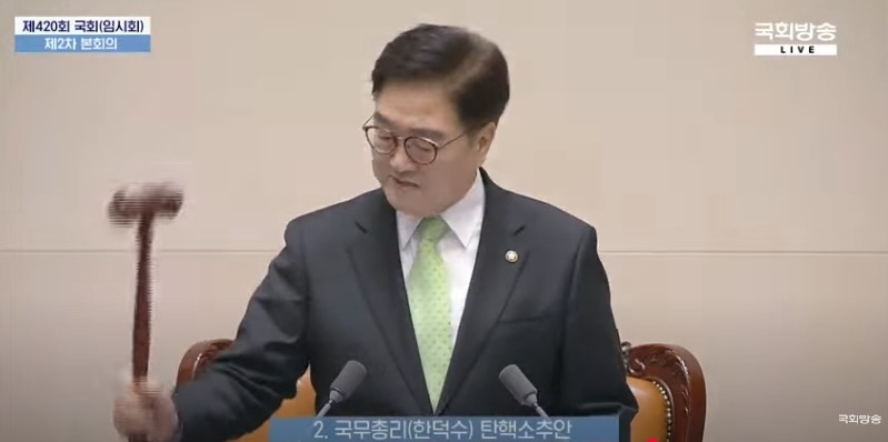 우원식 국회의장이 27일 국회 본회의에 상정된 한덕수 대통령 권한대행 겸 국무총리에 대한 탄핵소추안이 가결됐음을 선포하며 의사봉을 두드리고 있다. 우 의장은 탄핵안 가결 요건을 151석으로 정했다. 국회방송