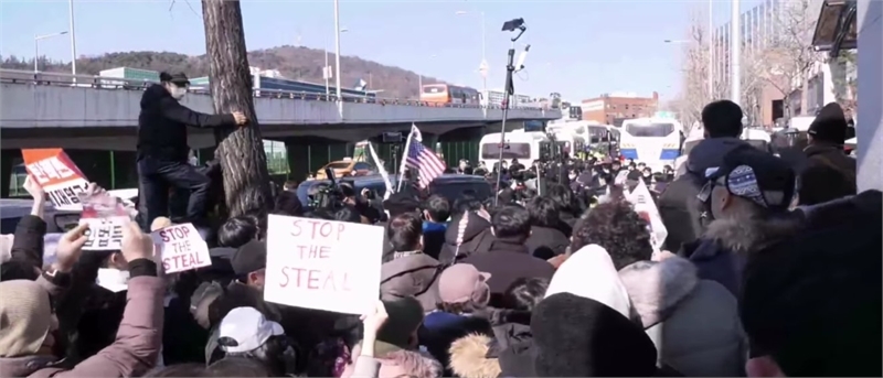 2일 서울 용산구 한남동 윤석열 대통령 관저 입구 앞에서 농성 중인 보수단체 회원 및 윤 대통령 지지자들. 시사포커스TV 유튜브 캡처