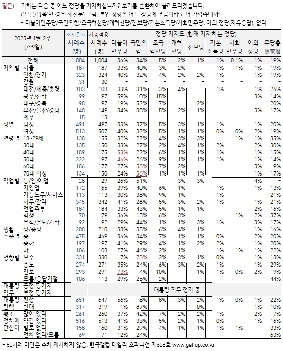 한국갤럽은 지난 7~9일 18세 이상 1004명을 대상으로 조사(전화 조사원 조사)한 결과 민주당 36%, 국민의힘 34%로 오차 범위(±3.1%포인트) 내 지지율을 기록했다고 발표했다.