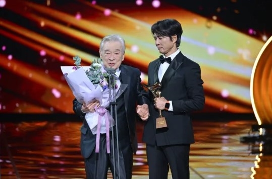 '2024 KBS 연기대상'에서 대상을 수상한 배우 이순재 씨. 89세로 역대 최고령 대상 수상자다. 후배 배우 최수종 씨가 부축하고 있다. KBS2