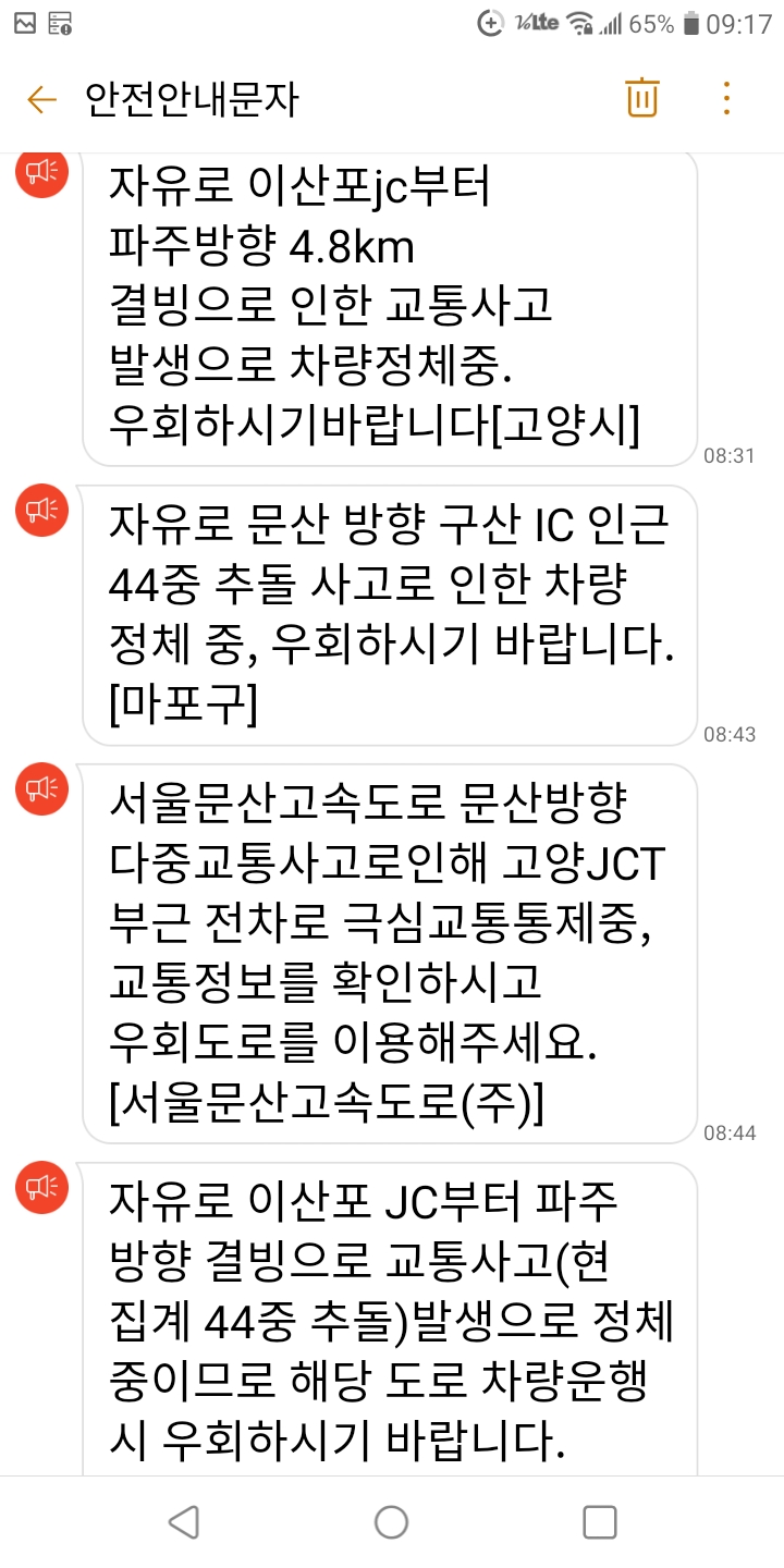 잇단 사고 안내문자. 사고 직후 4개 기관에서 동시 다발로 문자를 보냈다. 정기홍 기자
